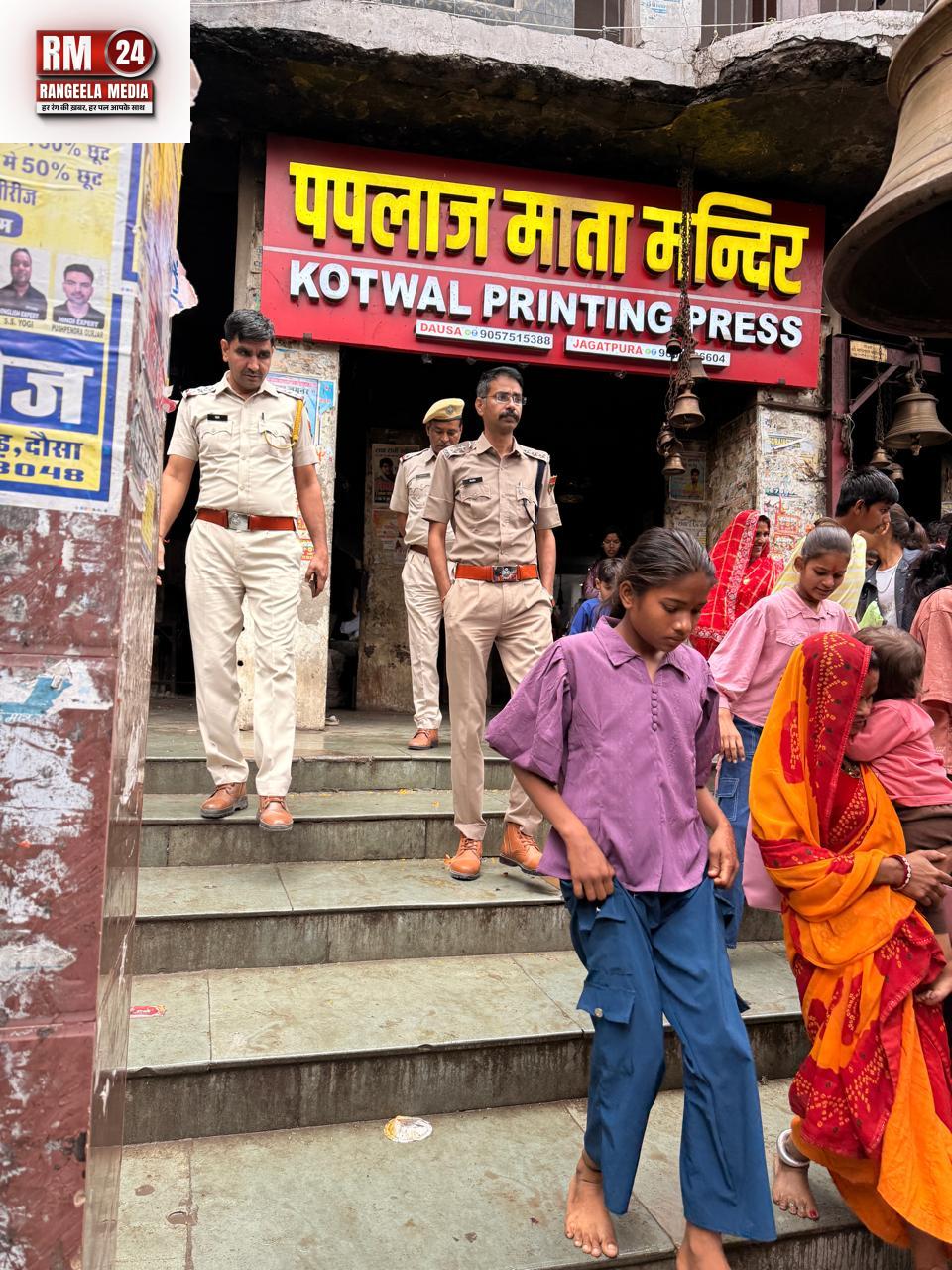 पपलाज माता मेले व्यवस्था को लेकर डिप्टी एसपी दिलीप मीना ने लिया सुरक्षा प्रबंधों का जायजा, दिए निर्देश लालसोट.क्षेत्र के प्रसिद्ध आस्था धाम पपलाज माता मंदिर पर अष्टमी के अवसर पर आयोजित होने वाले विशाल मेले के लिए पुलिस प्रशासन ने सुरक्षा प्र्रबंध और यातायात व्यवस्थाओं की तैयारियां तेज कर दी हैं। शुक्रवार को डिप्टी एसपी दिलीप मीना ने थानाधिकारी पवन कुमार जाट के साथ पपलाज माता मंदिर का दौरा किया। उन्होंने वहां पहुंचकर व्यवस्थाओं का निरीक्षण किया और मंदिर परिसर और आसपास के मार्गों पर सुरक्षा इंतजामों की समीक्षा की। डिप्टी एसपी दिलीप मीणा ने अधिकारियों को निर्देश दिए कि मेले के दौरान भीड़