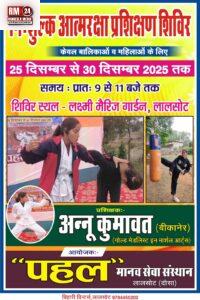 “पहल” मानव सेवा संस्थान द्वारा 25 दिसंबर से 30 दिसंबर 2025 तक आयोजित किए जा रहे “निशुल्क आत्मरक्षा प्रशिक्षण शिविर” के पोस्टर का विमोचन आज किया गया ।संस्थान के संयोजक सुनील गुप्ता व सचिव सुरेंद्र जांगिड़ ने बताया कि संस्थान द्वारा लक्ष्मी मैरिज गार्डन लालसोट में आयोजित किए जा रहे छ दिवसीय शिविर में अन्नू कुमावत (गोल्ड मेडलिस्ट, मार्शल आर्ट) मुख्य प्रशिक्षक रहेगी। शिविर में प्रशिक्षण लेने के लिए पूर्व में रजिस्ट्रेशन करवाना अनिवार्य है। शिविर में 10 वर्ष से अधिक की बालिकाएं व महिलाएं भाग ले सकेंगी। इस अवसर पर सोनू बिनौरी, दीपक पटेल,परीक्षित शर्मा, अंकुश आमेरिया, हीरालाल महावर, अविनाश शर्मा, जय प्रकाश शर्मा, दिलीप शर्मा, श्याम सुंदर सैनी, आदि मौजूद रहे।