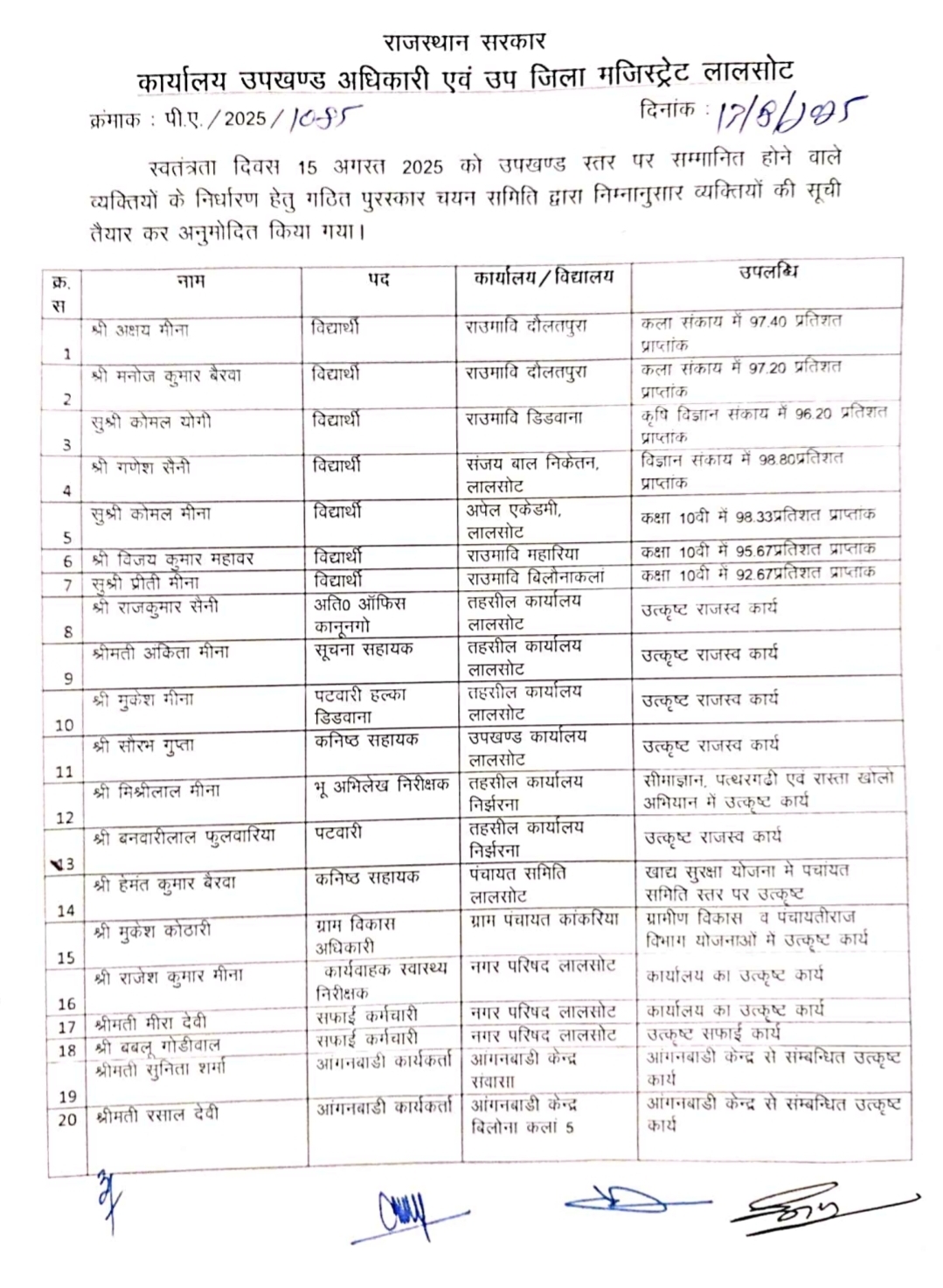 उपखण्ड स्तरीय स्वतंत्रता दिवस समारोह में सम्मानित होने वाले व्यक्तियों की सूची जारी। Read More » August 14, 2025